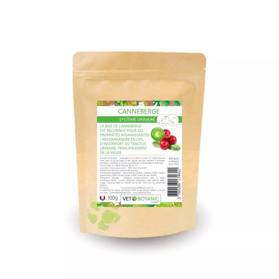 La canneberge est bénéfique pour le tractus urinaire du chat et du chien. En effet, grâce à sa richesse en antioxydants, elle possède des propriétés purifiantes pour le système urinaire. Sa teneur en vitamine C, en zinc et en magnésium aide à contrer les radicaux libres qui entrainent le vieillissement de l’organisme.