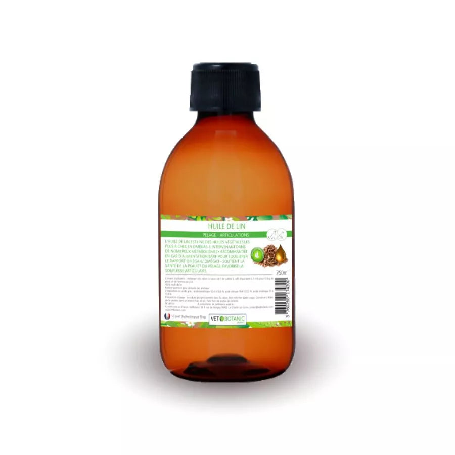 L’huile de lin est reconnue pour ses qualités nutritives. Elle est particulièrement riche en omega-3 dont l’acide alpha linolénique, un acide gras essentiel de la famille des omega-3. Cet acide gras est essentiel car les chiens et les chats ne sont pas capables de les produire naturellement ou du moins pas en quantité suffisante. On se doit donc de l’apporter via l’alimentation. Or la plupart des nourritures industrielles ne contiennent pas un niveau adapté d’acides gras essentiels : l’huile de lin ajoutée à l’alimentation quotidienne de votre animal favorisera alors sa bonne santé. Nous vous conseillons donc l’huile de lin afin de faire reprendre de l’état à votre animal convalescent âgé ou anémié et ainsi favoriser sa mobilité.